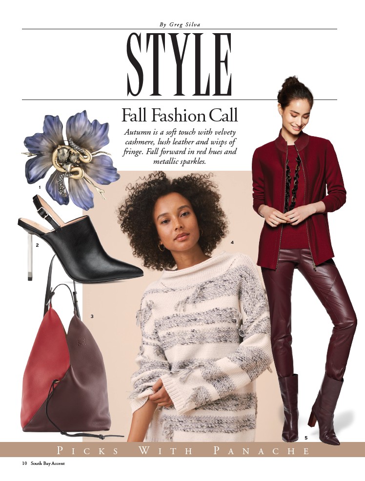 B y G r e g S i l v a STYLE P i c k s W i t h P a n a c h e 10 South Bay Accent Fall Fashion Call Autumn is a soft touch with velvety cashmere, lush leather and wisps of fringe. Fall forward in red hues and metallic sparkles. 1 5 4 2 3